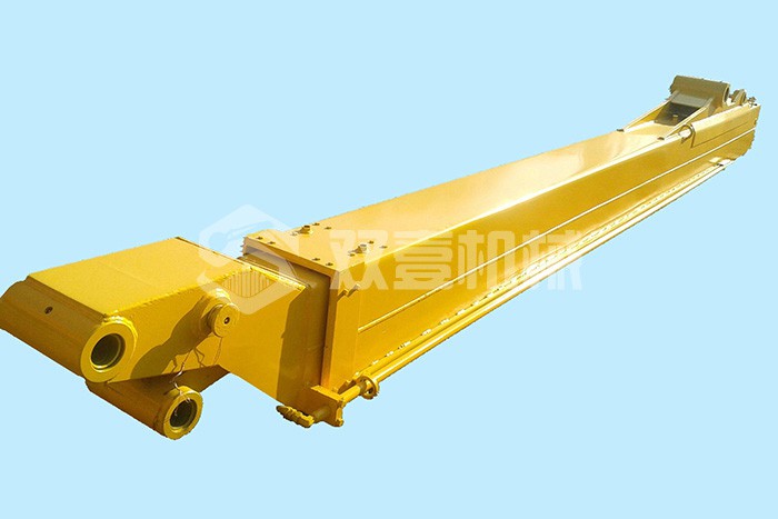 兩節伸縮臂是雙壹機械2005年自主研發的突破性產品,被多家同行模仿制造,從未被超越;臂長度19米,采用高噸位的三機聯動折彎設備折成U型,雙U型對接的焊接方式。